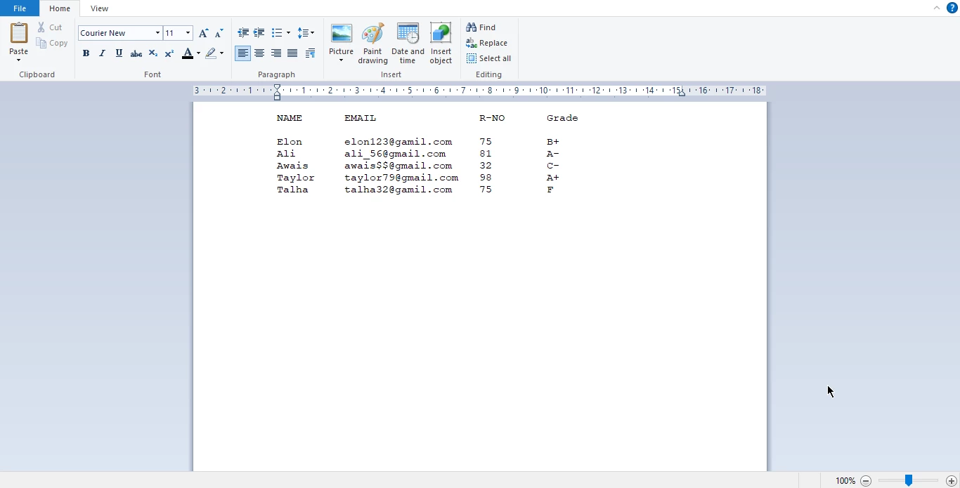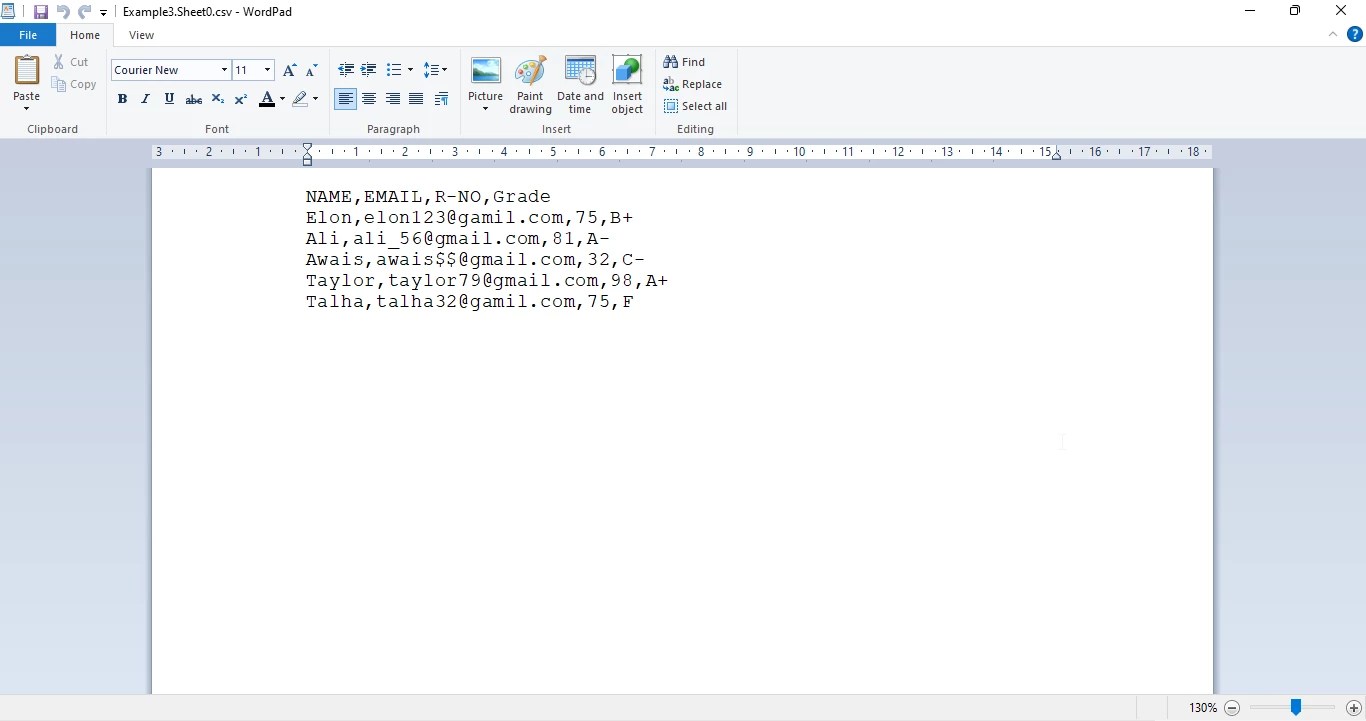 WordPad-Dokument mit einer CSV-Datei, die Schülerdaten wie Namen, E-Mail-Adressen, Matrikelnummern und Noten (durch Kommas getrennt) enthält. Beispiel einer in WordPad geöffneten CSV-Datei mit Schülerdatensätzen, deren Felder für Name, E-Mail-Adresse, Matrikelnummer und Note durch Kommas getrennt sind.