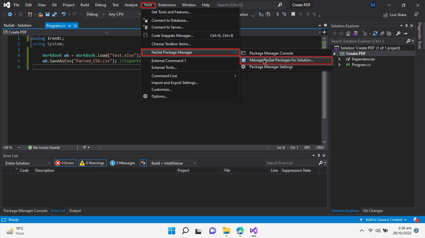 ![C# CSV Parser (Schritt-für-Schritt) Tutorial, Abbildung 4: NuGet-Paket-Manager-Konsole in Visual Studio über das Extras-Menü aufrufen](<a href="/static-assets/excel/blog/csharp-csv-parser-tutorial/csharp-csv-parser-tutorial-4.webp") NuGet-Paket-Manager-Konsole in Visual Studio aufrufen Der Installationsprozess kümmert sich automatisch um alle Abhängigkeiten und konfiguriert Ihr Projekt für die Bearbeitung von Excel-Dateien .