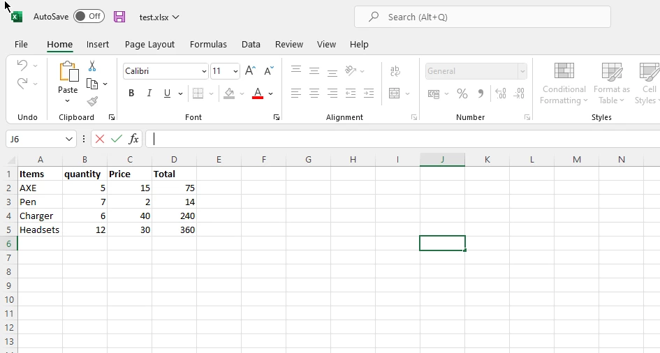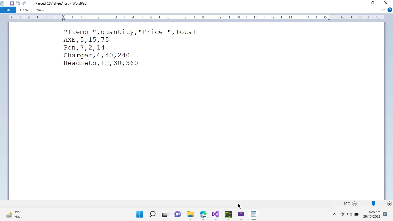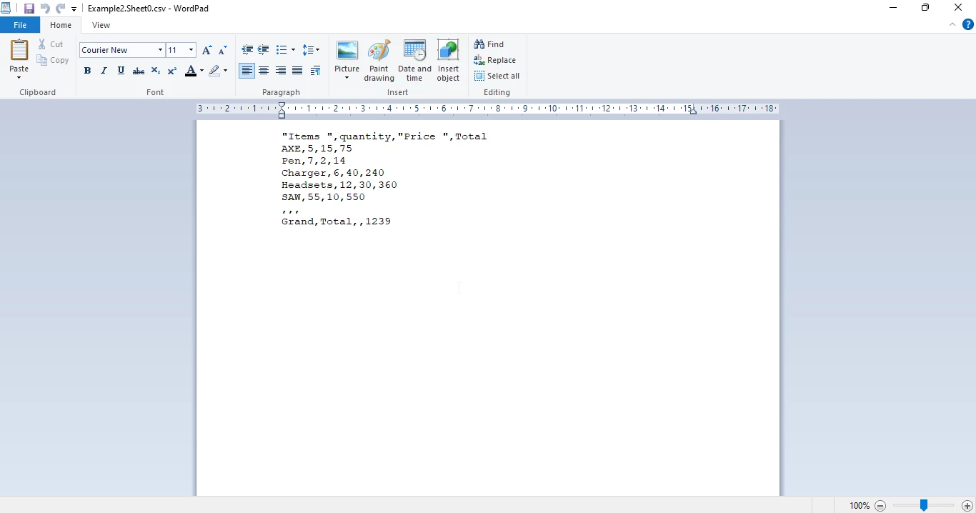 Die in WordPad geöffnete CSV-Datei zeigt Produktdaten mit den Spaltenüberschriften "Artikel", "Menge", "Preis" und "Gesamt" sowie Einträge für AXE, Stift, Ladegerät und Headsets mit ihren jeweiligen Werten. Abbildung 7: Die von der Methode " WorkBook SaveAsCsv generierte CSV-Ausgabe, die die konvertierten Excel-Daten im kommagetrennten Format anzeigt.