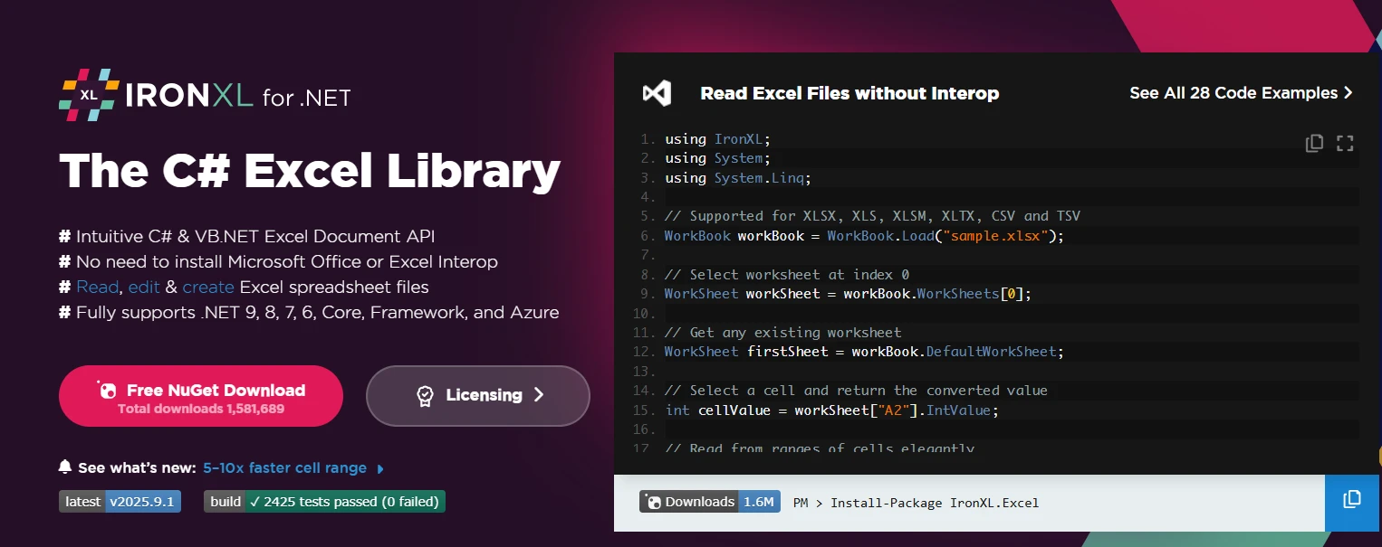 IronXL-Homepage mit C#-Codebeispiel zum Lesen von Excel-Dateien ohne Microsoft Office-Interop-Abhängigkeiten