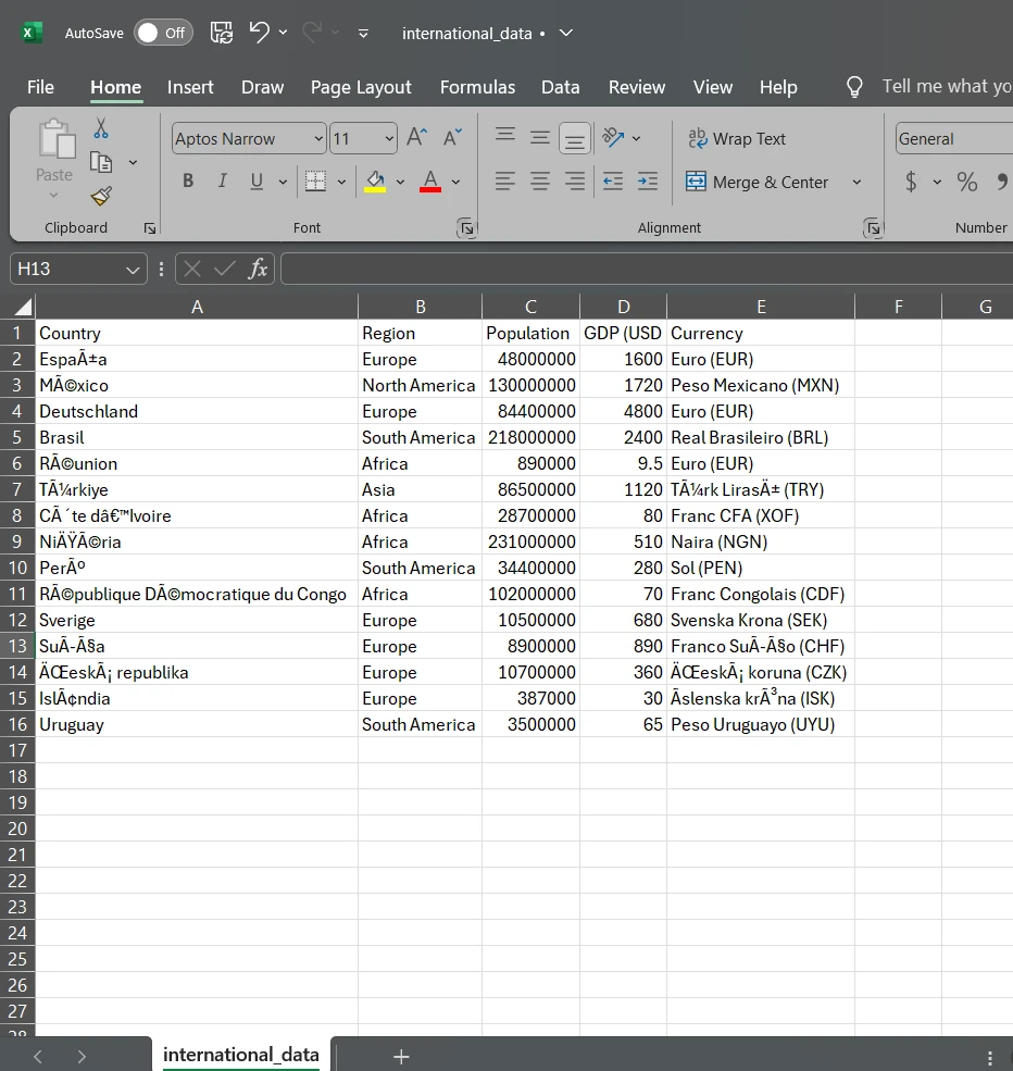 ! Microsoft Excel-Tabelle mit einem großen Datensatz, der Spalten für Land, Region, Stadt, Bevölkerung, BIP, Währung, Breitengrad und Längengrad enthält und verschiedene internationale Dateneinträge anzeigt.