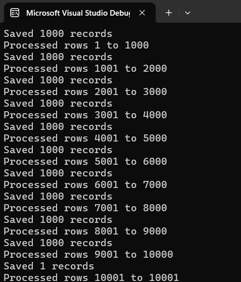 Konsolenausgabe zur Stapelverarbeitung von CSV-Datensätzen in Gruppen von 1000 mit Fortschrittsmeldungen für die Zeilen 1 bis 10001