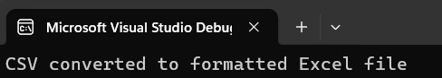 Die Visual Studio-Debugkonsole zeigt nach erfolgreicher Konvertierung die Meldung "CSV in formatierte Excel-Datei konvertiert" an.