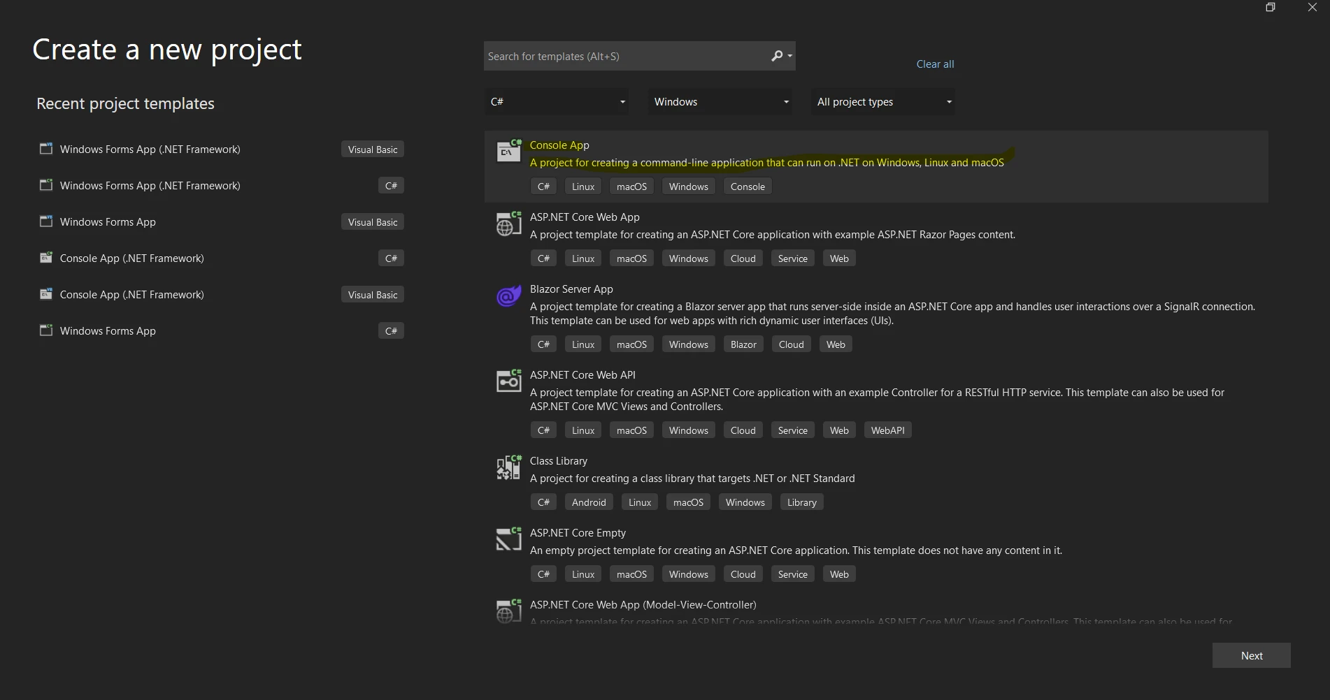 Der Dialog "Neues Projekt erstellen" von Visual Studio zeigt verschiedene .NET-Projektvorlagen an, darunter die Optionen Konsolenanwendung, ASP.NET Core-Webanwendung und Blazor-Serveranwendung. Erstellen Sie ein neues Projekt in Visual Studio