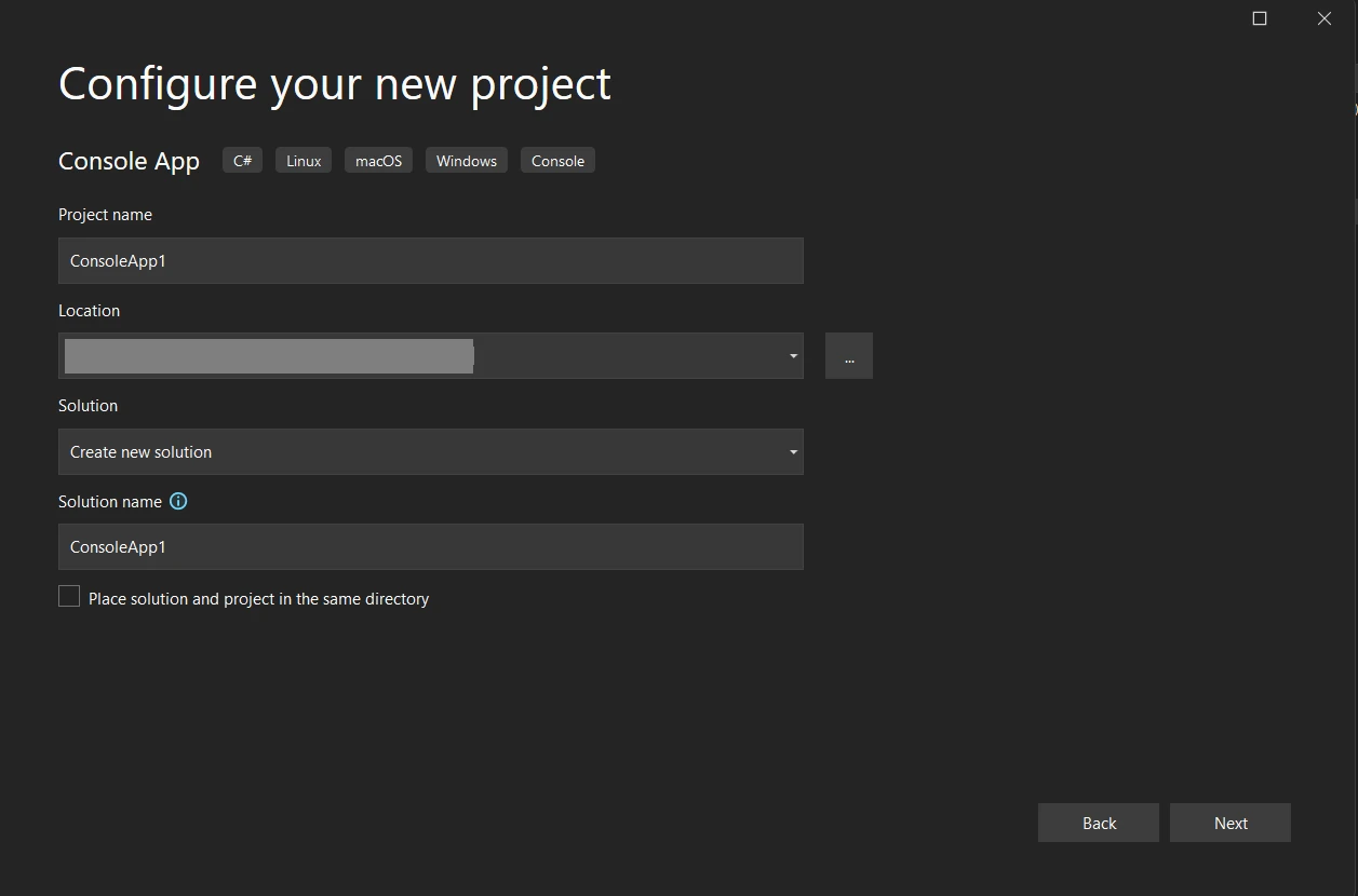 ! Visual Studio-Projektkonfigurationsdialog, der die Einrichtung für eine neue C#-Konsolenanwendung mit dem Projektnamen 'ConsoleApp1' anzeigt, die auf Windows mit Konsolenausgabe abzielt. Das neue Projekt konfigurieren