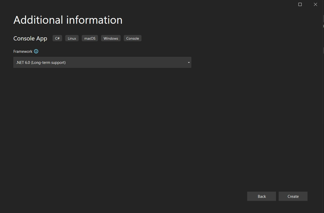 ! Dialogfeld zur Erstellung eines Visual Studio-Projekts, in dem die Konfiguration einer Konsolenanwendung mit .NET 6.0 (Langzeitunterstützung) als Framework ausgewählt ist. Wählen Sie eine .NET Framework-Version
