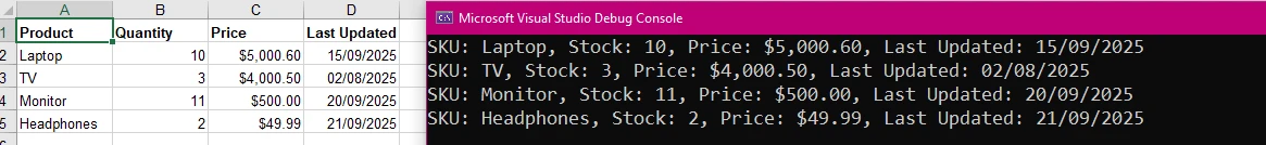 ! Geteilter Bildschirm: Links eine Excel-Tabelle mit Bestelldaten, rechts die Visual Studio-Debugkonsole mit den extrahierten Daten.
