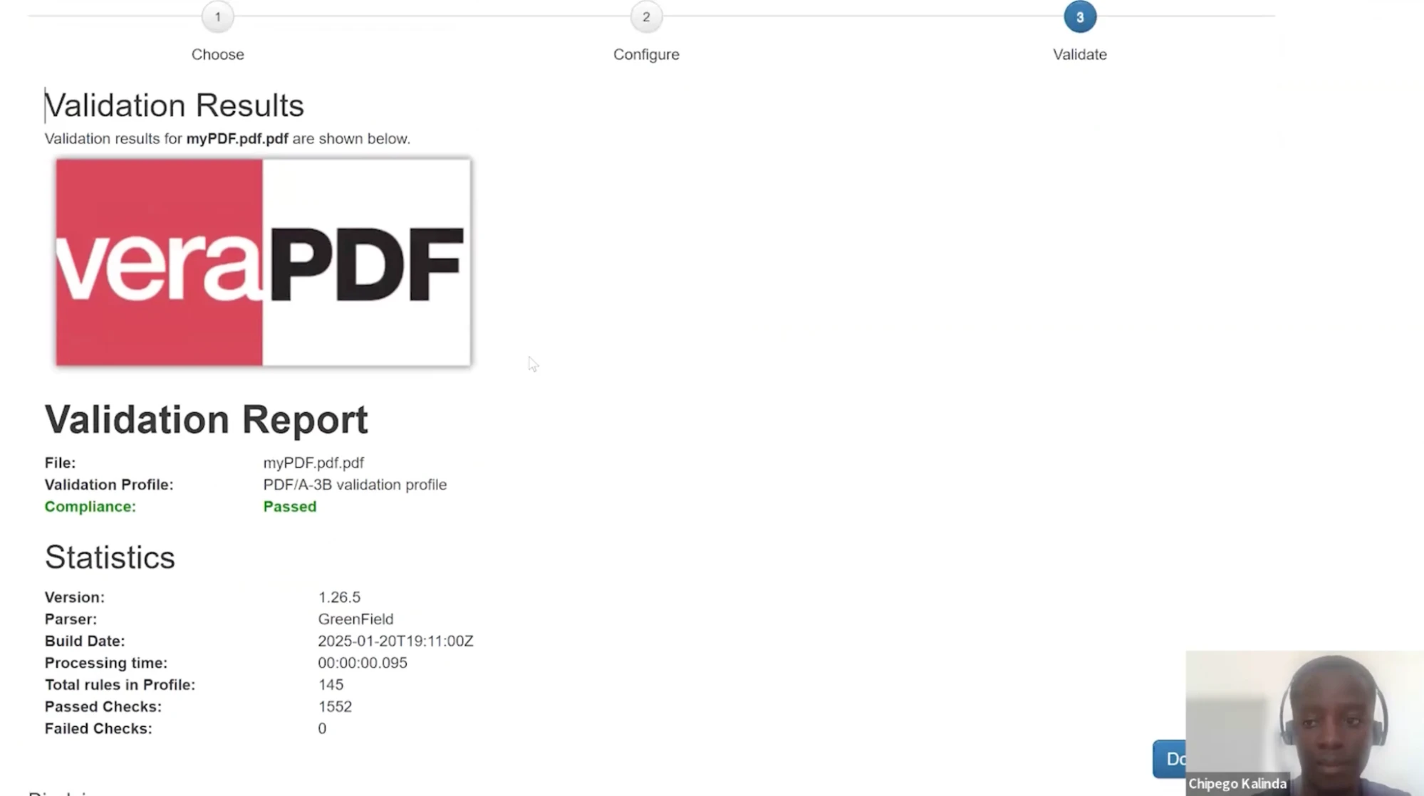 Das Ergebnis wurde mit VeraPDF, einem Validierungstool für Zugänglichkeits- und Archivierungsstandards, überprüft. Dieser Validierungsschritt ist für Organisationen, die die Einhaltung von Vorschriften im Rahmen von Audits oder regulatorischen Anforderungen nachweisen müssen, von entscheidender Bedeutung.