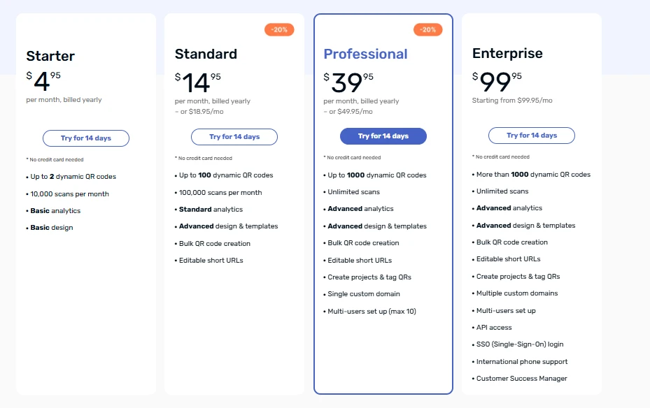 Die Preisstufen von QRCodeKit: Starter (4,95 $/Monat), Standard (14,95 $/Monat), Professional (39,95 $/Monat mit 20 % Rabatt) und Enterprise (99,95 $/Monat) mit Funktionsvergleich für Compliance-orientierte Organisationen