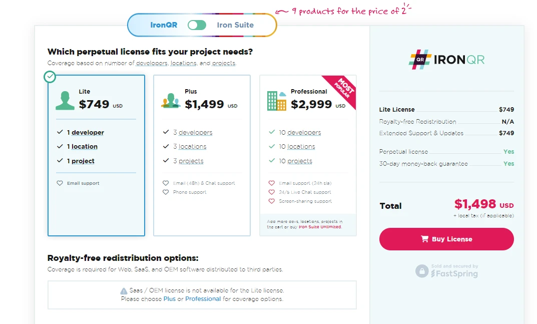 Die IronQR-Preisseite zeigt drei Lizenzstufen (Lite 749 $, Plus 1.499 $, Professional 2.999 $) mit einem Schalter zur Auswahl zwischen IronQR und Iron Suite sowie die Aktion "9 Produkte zum Preis von 2".
