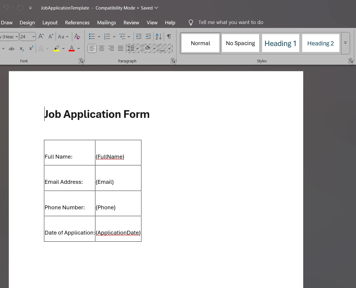 Dieser Code erstellt eine neue Dokumentinstanz mithilfe der WordDocument Klasse und baut ein strukturiertes Formular mithilfe der Table-Klasse auf. Jede Zeile enthält in der ersten Zelle eine Bezeichnung und in der zweiten Zelle einen Platzhalter (in geschweiften Klammern). Die Klasse TextContent verarbeitet einfachen Textinhalt, während TextStyle die Formatierung anwendet. Die Platzhaltersyntax { FieldName } kennzeichnet Bereiche, in denen Sie den Text später durch tatsächliche Daten ersetzen werden. Dieser Ansatz bietet eine ähnliche Flexibilität wie die Verwendung der IronWord-Dokumentation für erweiterte Formatierungsoptionen.
