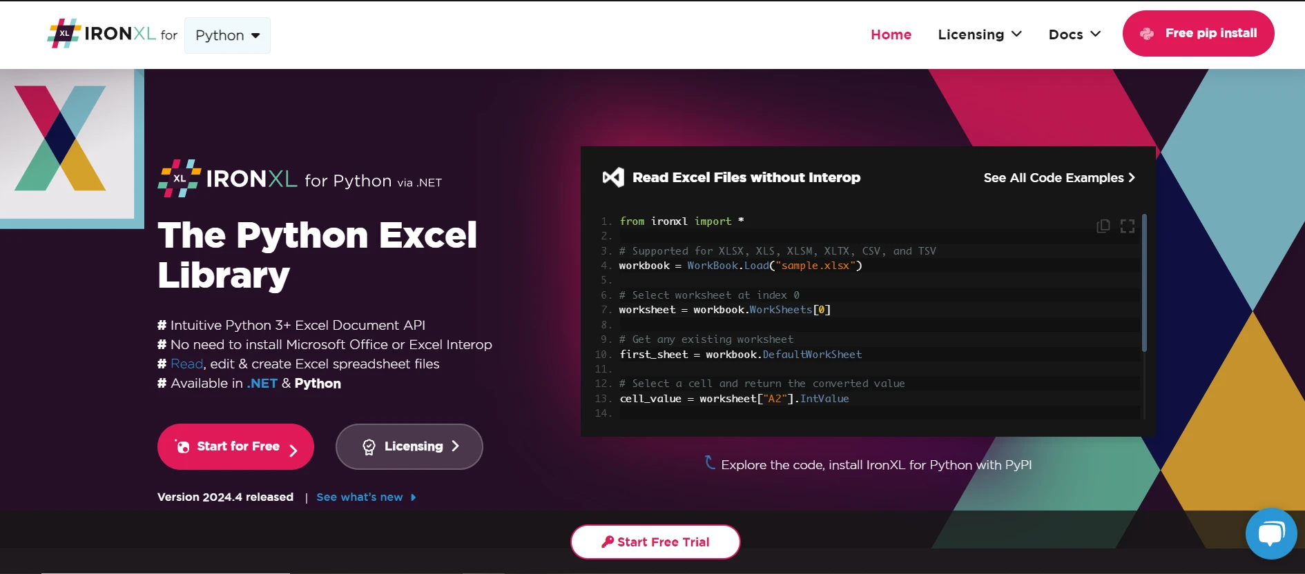 Im Gegensatz dazu zeichnet sich IronXL für Python als eine umfassendere Lösung für die Bearbeitung von Excel-Dateien in Python aus. Mit seinem umfangreichen Funktionsumfang eignet sich IronXL für Python hervorragend für Projekte, die eine intensive Excel-Bearbeitung erfordern, einschließlich erweiterter Formatierung, komplexer Formelberechnungen und der Integration mit .NET-Projekten. Die Fähigkeit, Sicherheitsfunktionen wie Dateiverschlüsselung und die Festlegung von Zugriffsberechtigungen zu handhaben, bietet eine zusätzliche Nutzenebene für Unternehmensanwendungen. IronXL für Python bietet außerdem eine ausführliche Dokumentation mit zahlreichen Codebeispielen , was es Entwicklern aller Erfahrungsstufen erleichtert, die Funktionen effektiv zu implementieren. Darüber hinaus wird IronXL für Python von einem reaktionsschnellen Entwicklerteam unterstützt, sodass bei Bedarf schnell Hilfe zur Verfügung steht.