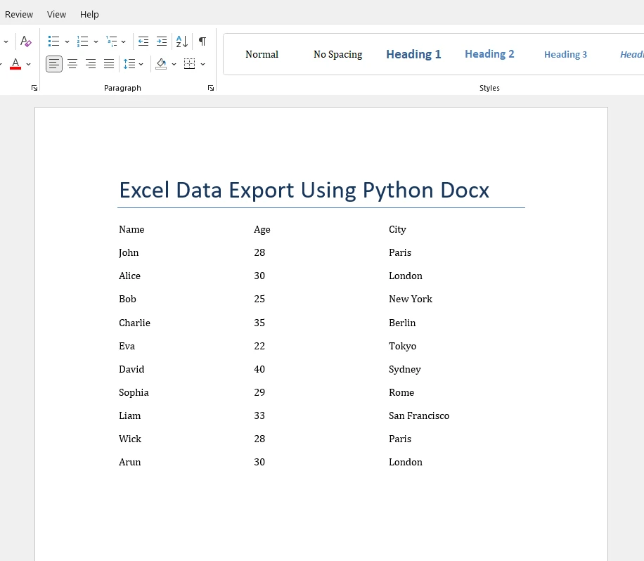 Schritt 5: Erstellen Sie ein Word-Dokument und fügen Sie Excel-Daten mithilfe von python-docx ein.