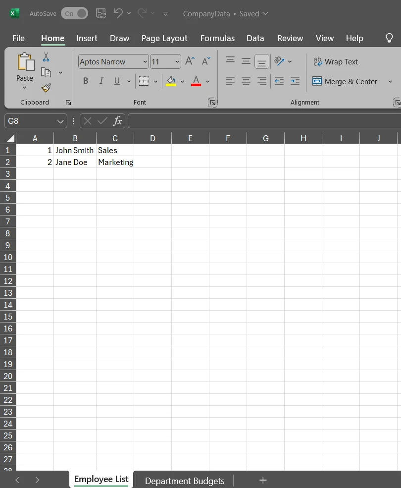 workBook.SaveAs("CompanyData.xlsx")Cada DataTable de su DataSet se convierte en una hoja de cálculo separada en el archivo Excel, manteniendo la separación lógica de sus datos. Este enfoque es particularmente útil para crear informes integrales que requieren hojas de trabajo individuales para diferentes categorías de datos, todo dentro de un solo archivo. Según la documentación de Microsoft sobre DataSets, esta estructura refleja la naturaleza relacional de los esquemas de base de datos.