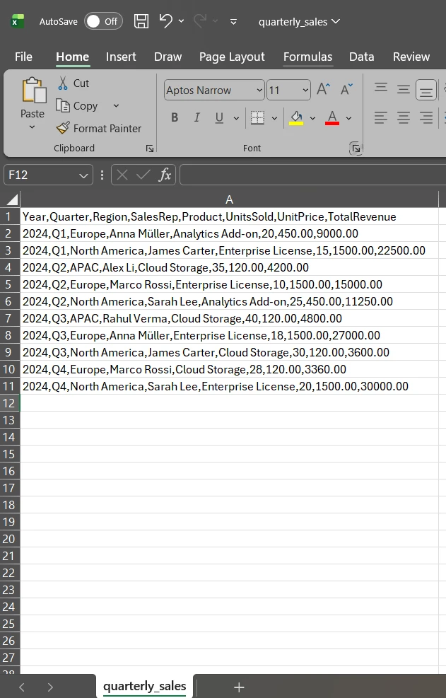 WorkBook workbook = WorkBook.LoadCSV("quarterly_sales.csv", ExcelFileFormat.XLSX);
