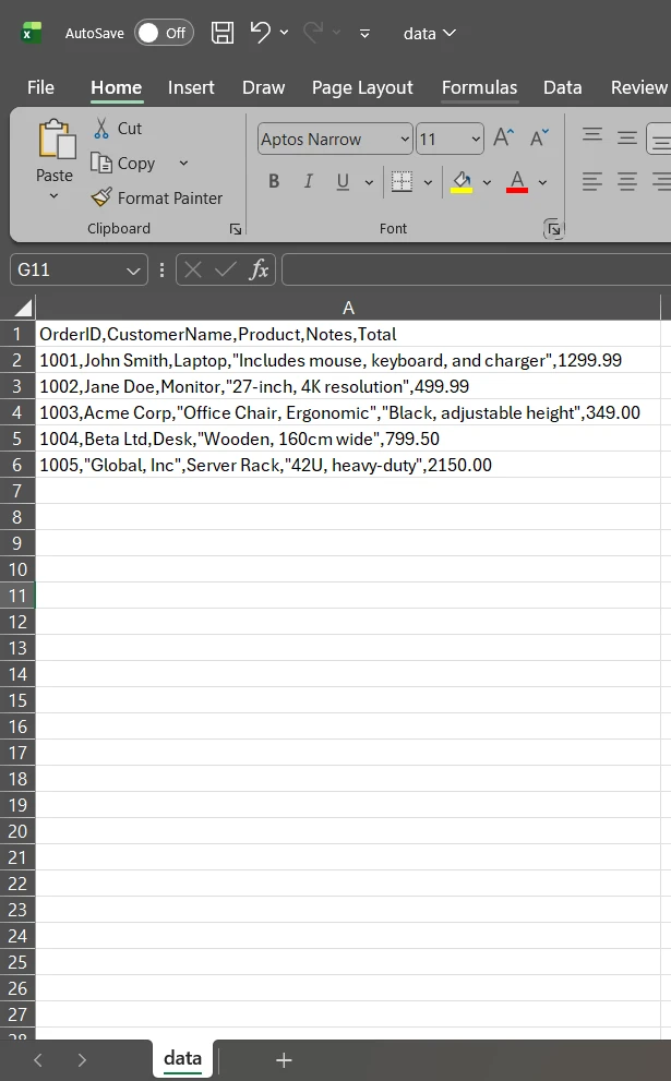 Lector CSV Rápido de C#: Procesamiento CSV optimizado con IronXL: Imagen 7 - Entrada de ejemplo