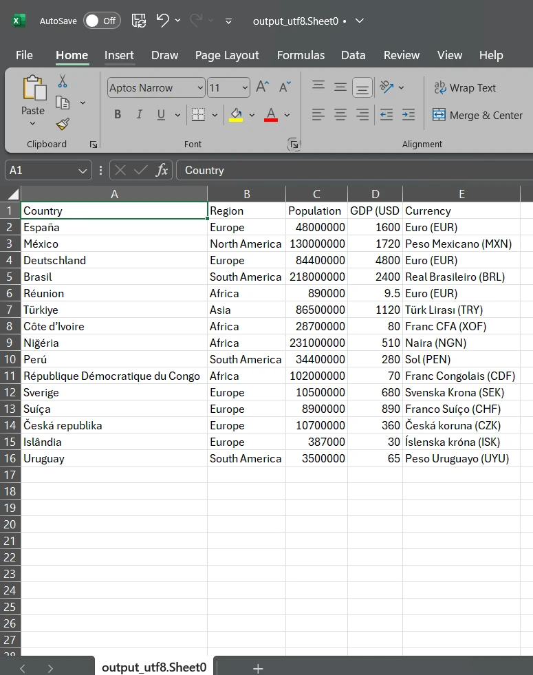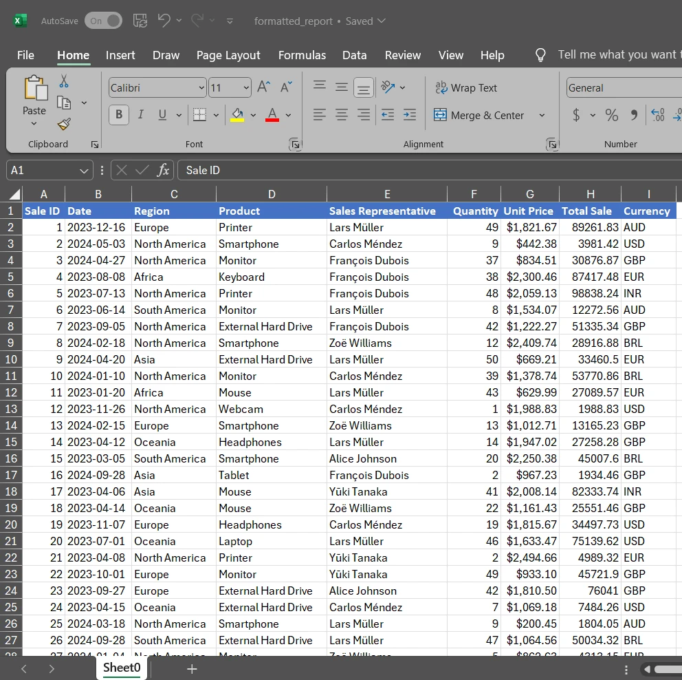 Console.WriteLine("CSV converted to formatted Excel file");Este proceso de conversión transforma datos CSV simples en libros de Excel con formato profesional utilizando nuestro eficiente analizador CSV de C#. El código aplica formato en negrita y colores a los encabezados, creando una jerarquía visual. El formato de moneda con separadores de miles mejora la legibilidad numérica. AutoSizeColumn ajusta el ancho para adaptarse al contenido. El archivo Excel resultante mantiene todo el formato cuando se abre en aplicaciones de hojas de cálculo. Para obtener más opciones, consulte nuestra guía de formato de celda . También puede agregar patrones y colores de fondo , fusionar celdas o agregar hipervínculos para mejorar la interactividad.