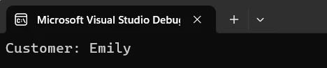 La consola de depuración de Visual Studio muestra la salida con el texto "Cliente: Emily".
