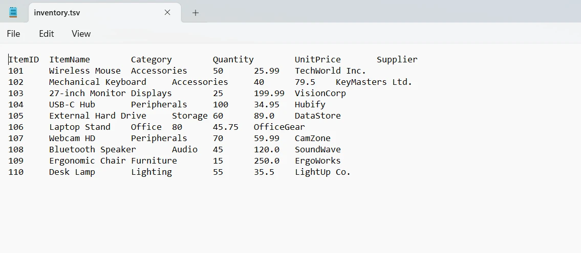 WorkBook workbook = WorkBook.LoadCSV("inventory.tsv",