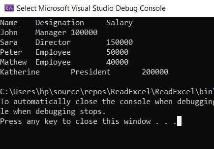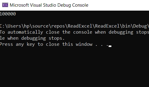 Ventana de la consola de depuración de Microsoft Visual Studio que muestra el resultado de una operación de lectura de un archivo de Excel, la ruta del archivo y un mensaje de finalización. La salida de la consola de depuración después de leer con éxito un archivo de Excel en C#. El programa ha completado la ejecución y está esperando la entrada del usuario para cerrar.
