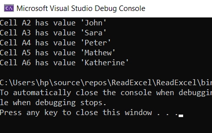 Consola de depuración de Microsoft Visual Studio que muestra el resultado de la lectura de las celdas A2 a A6 de Excel, mostrando los nombres: John, Sara, Peter, Mathew y Katherine Salida de consola que demuestra la lectura exitosa de un rango de celdas de Excel (A2:A6) que contienen nombres usando C#