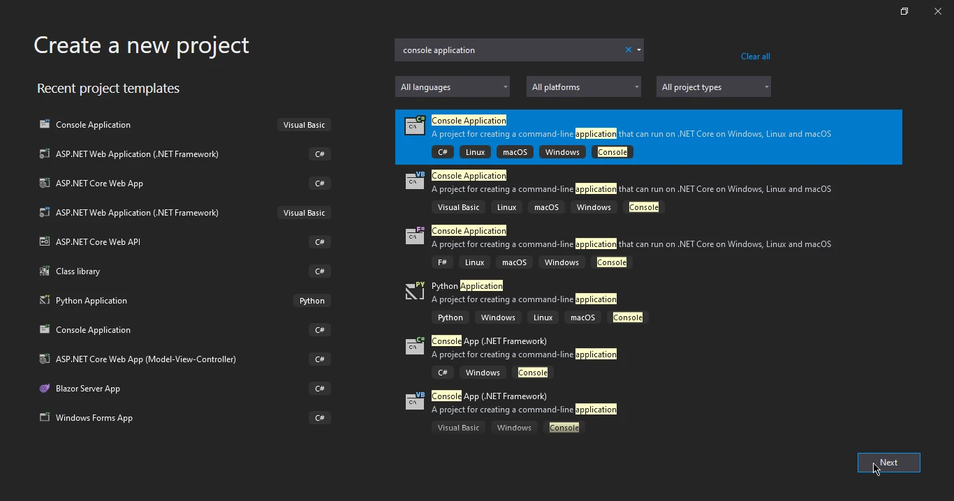 Aparecerá una nueva ventana. Haga clic en la barra de búsqueda y escriba Aplicación de consola. Seleccione el que tenga la opción C#. Luego haz clic en el botón Siguiente.
