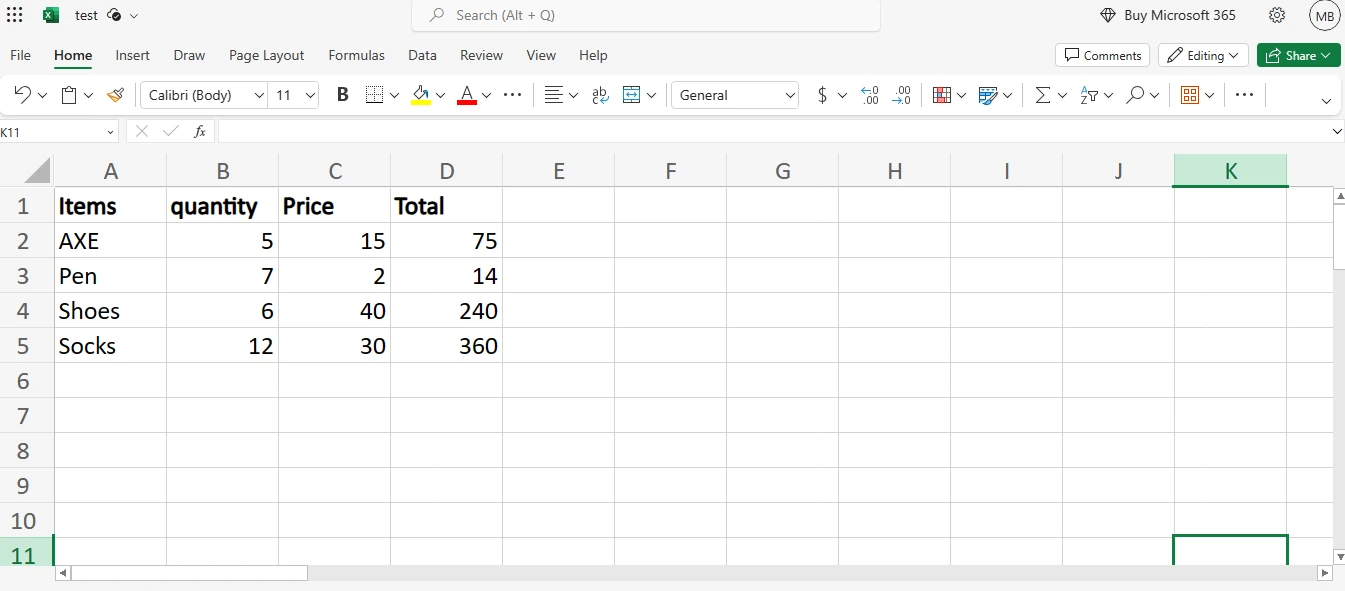 Hoja de cálculo de Excel que muestra una tabla de inventario simple con columnas de artículos, cantidad, precio y total que contienen datos de hacha, bolígrafo, zapatos y calcetines. El archivo de entrada de Excel