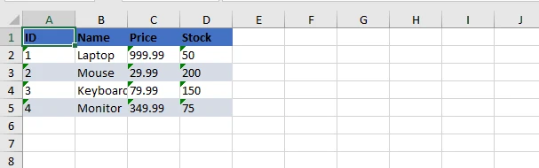 dt.Rows.Add(1, "Laptop", 999.99, 50);