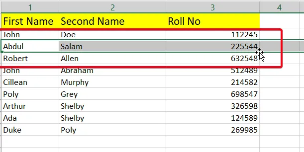Hoja de cálculo de Excel que muestra una tabla con columnas de Nombre, Apellido y N.º de lista, con la fila 3 (Abdul Salam) resaltada con un borde discontinuo en movimiento que indica la operación de corte.