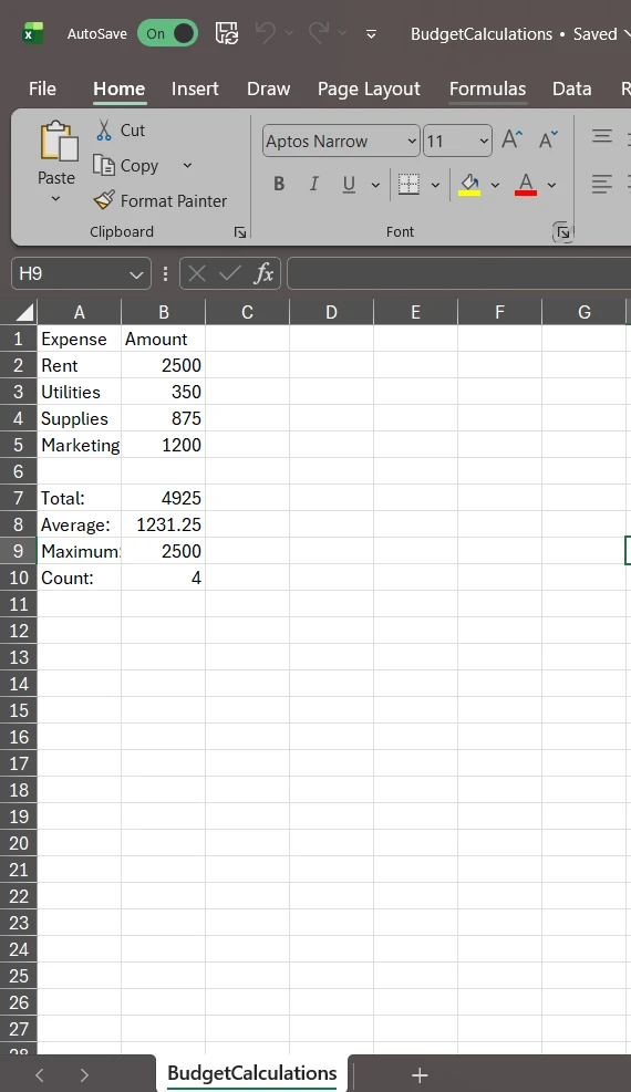 workbook.SaveAs("BudgetCalculations.xlsx");La propiedad Fórmula acepta la sintaxis estándar de las fórmulas de Excel: las mismas fórmulas que funcionan en Microsoft Excel funcionan aquí. Después de configurar las fórmulas, llame a EvaluateAll() para calcular los resultados. Este paso garantiza que los valores calculados estén disponibles inmediatamente a través de propiedades tipificadas como DecimalValue, IntValue o StringValue. Sin llamar a EvaluateAll(), las fórmulas siguen guardándose correctamente y calculando cuando se abren en Excel, pero el acceso programático a los resultados requiere una evaluación previa.