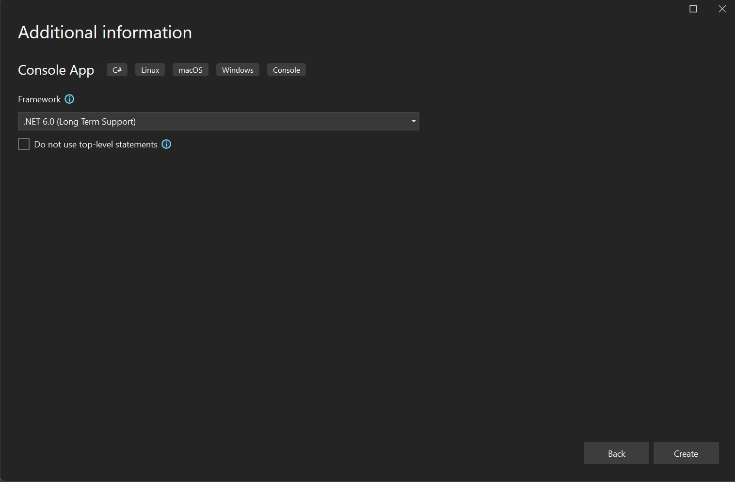 Seleccione un .NET Framework utilizando la opción desplegable Framework. Aquí, estamos usando .NET 6.0, la versión con soporte a largo plazo. Luego presione Crear.