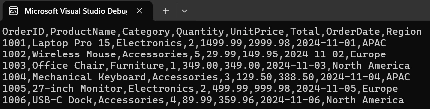 Leer CSV .NET: The Simplest C# Approach Using IronXL: Image 5 - Manual CSV Parsing Output