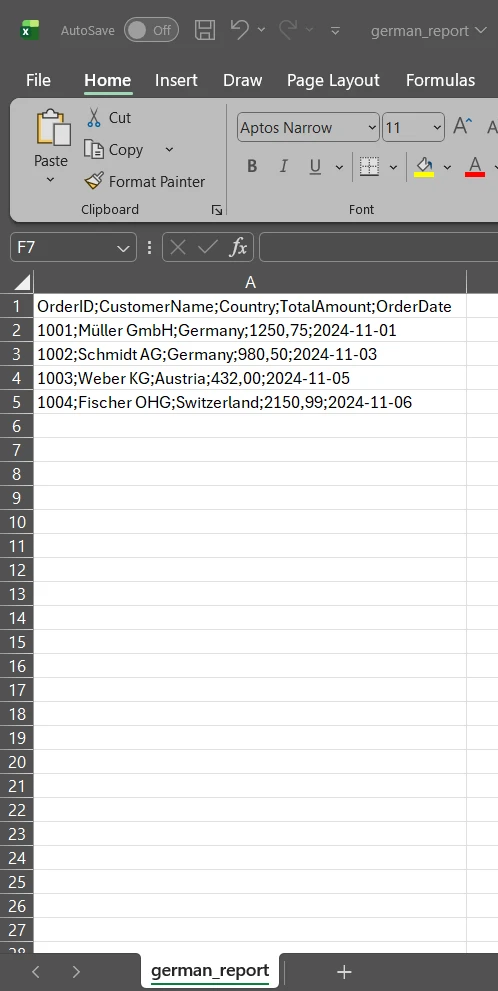 WorkBook euroData = WorkBook.LoadCSV("german_report.csv", fileFormat: ExcelFileFormat.XLSX, listDelimiter: ";");