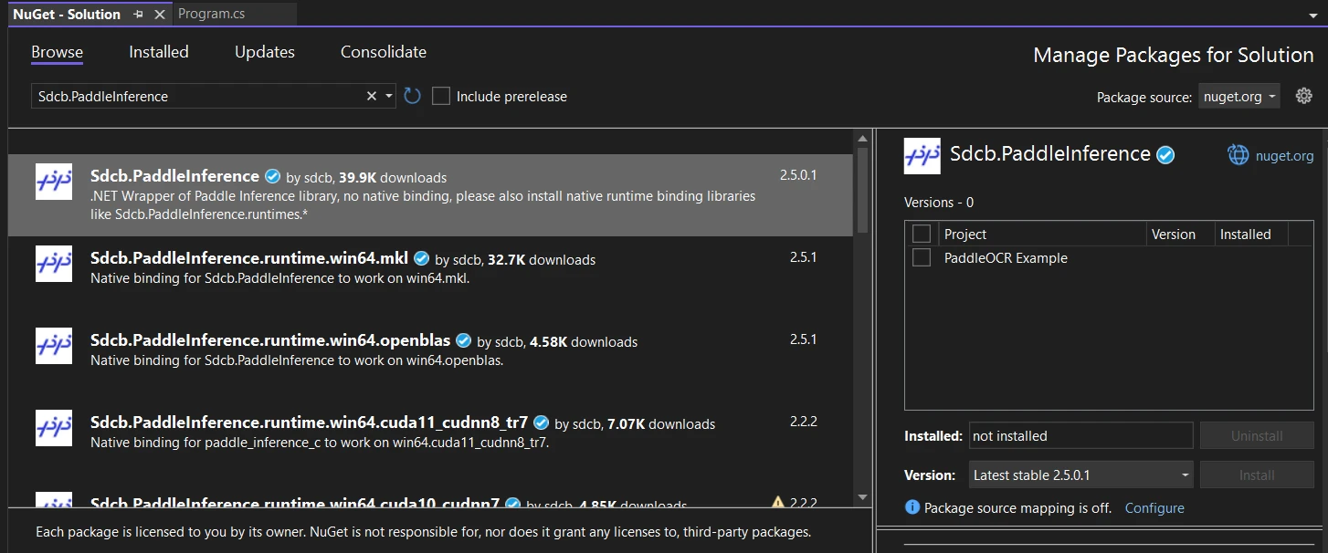 Paddle OCR vs Tesseract (Comparación de Características OCR): Figura 1 - Explorando Sdcb.PaddleInference en el gestor de paquetes NuGet