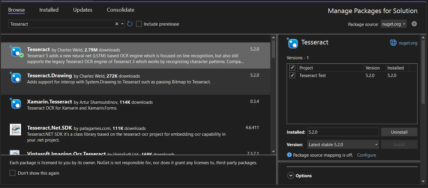 Paddle OCR vs Tesseract (Comparación de Características OCR): Figura 3 - Instalando Tesseract con el gestor de paquetes NuGet