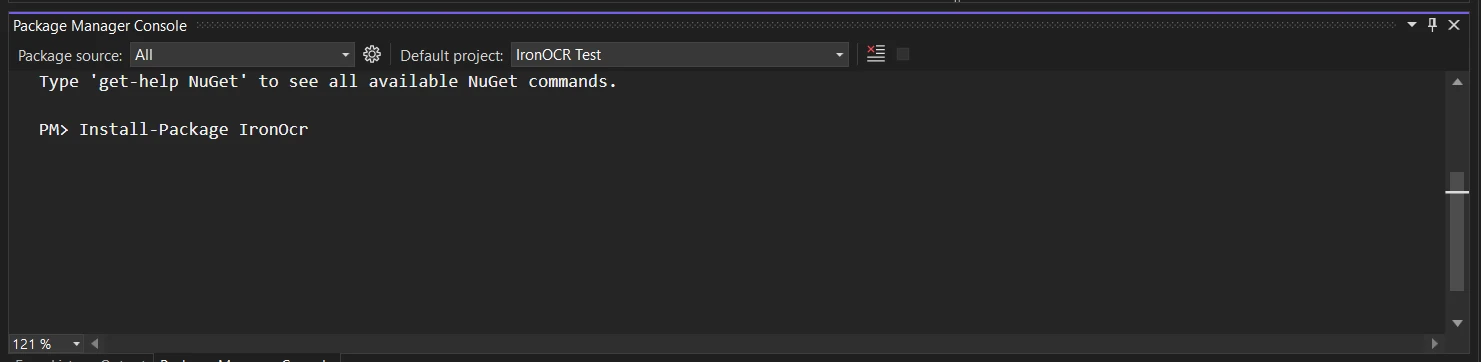 Paddle OCR vs Tesseract (Comparación de Características OCR): Figura 5 - Usando la consola del administrador de paquetes para instalar IronOCR