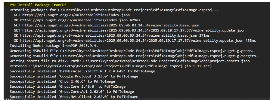 C# Convert PDF to Image: Guía completa para desarrolladores: Imagen 1 - Instalación de IronPDF a través de la consola del gestor de paquetes NuGet