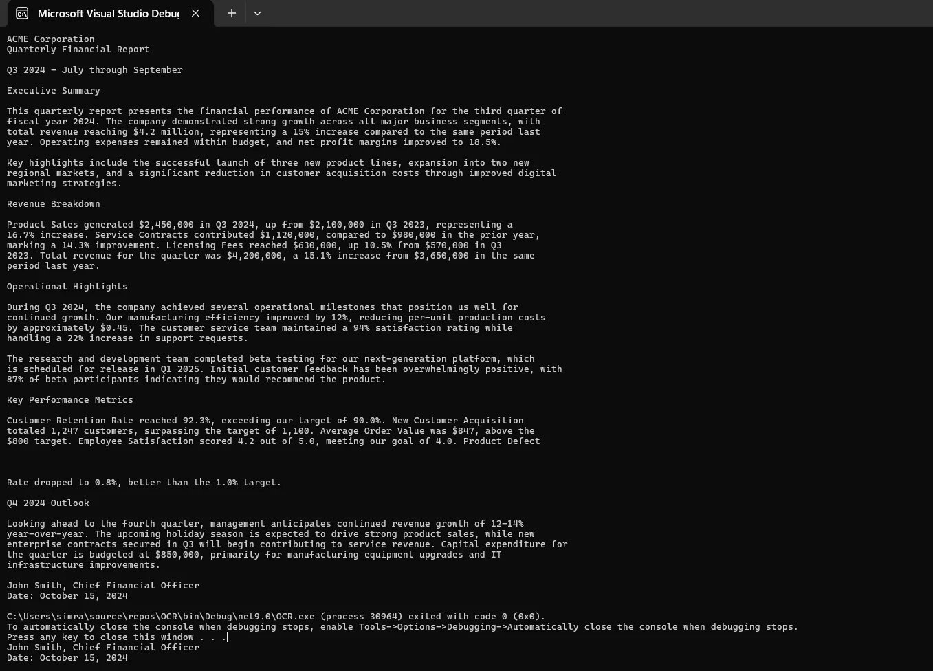 Console.WriteLine(result.Text);Tenga en cuenta que IronOCR utiliza la indexación basada en cero, por lo que la página 0 representa la primera página de su documento PDF. Este enfoque selectivo reduce el tiempo de procesamiento y el consumo de memoria cuando se trabaja con documentos escaneados de varias páginas en los que solo determinadas secciones contienen datos relevantes para la búsqueda.