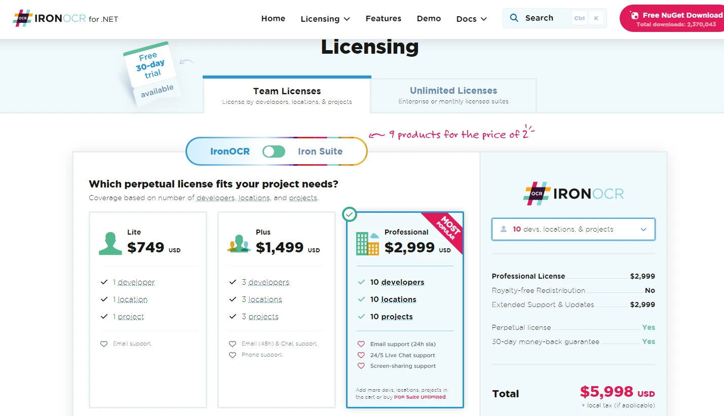 Antes de utilizar IronOCR, necesitará una clave de licencia. Obtenga una prueba gratuita aquí . Las opciones de licencia incluyen los niveles Lite, Plus y Professional para diferentes tamaños de equipos e implementaciones. Consulte la documentación para aplicar claves de licencia .
