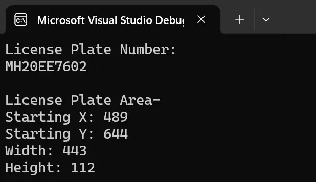 Dim output As String = $"License Plate Number:" & vbLf & "{result.Text}" & vbLf & vbLf & $"License Plate Area_" & vbLf & $"Starting X: {rectangle.X}" & vbLf & $"Starting Y: {rectangle.Y}" & vbLf & $"Width: {rectangle.Width}" & vbLf & $"Height: {rectangle.Height}"