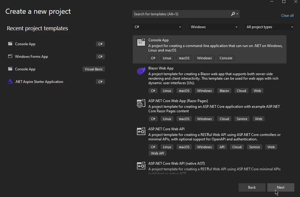 - Seleccione "Aplicación de consola" y haga clic en Siguiente. Elija la versión C# si aparecen varias opciones.