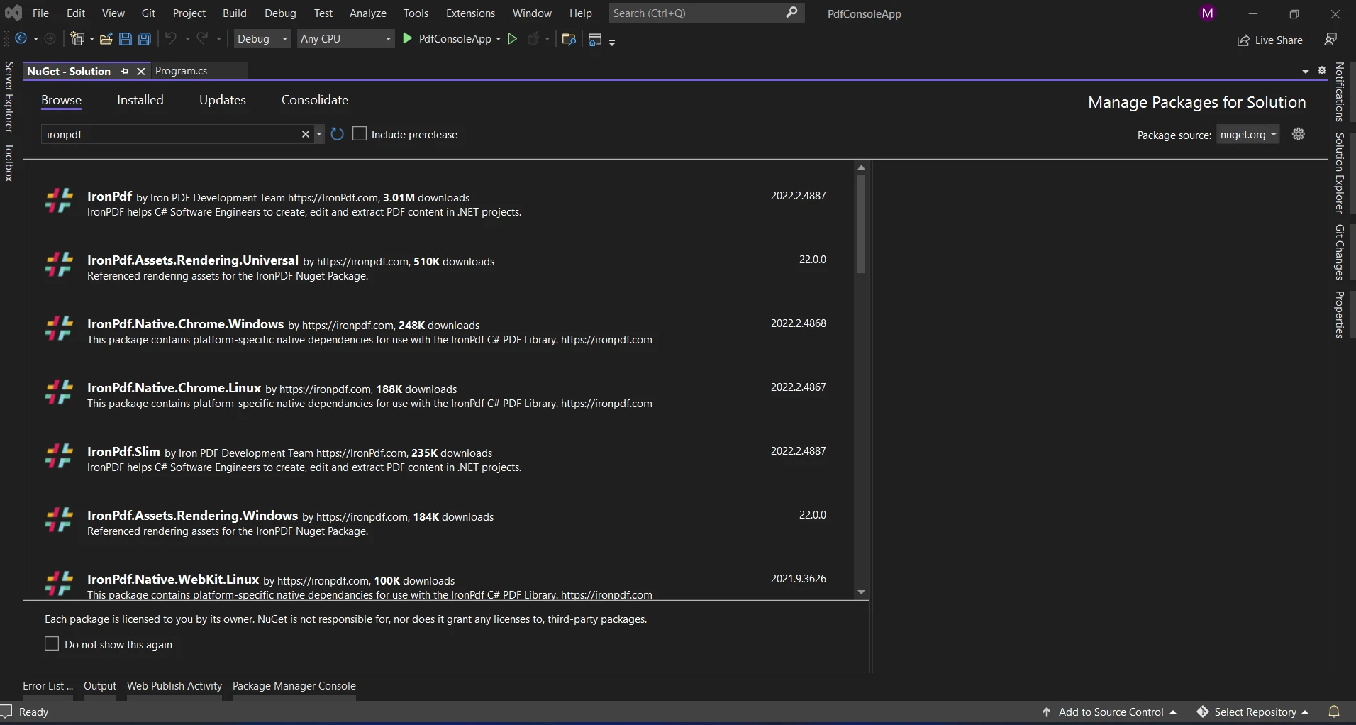 2. En el proyecto generado, instalar la biblioteca IronZIP.