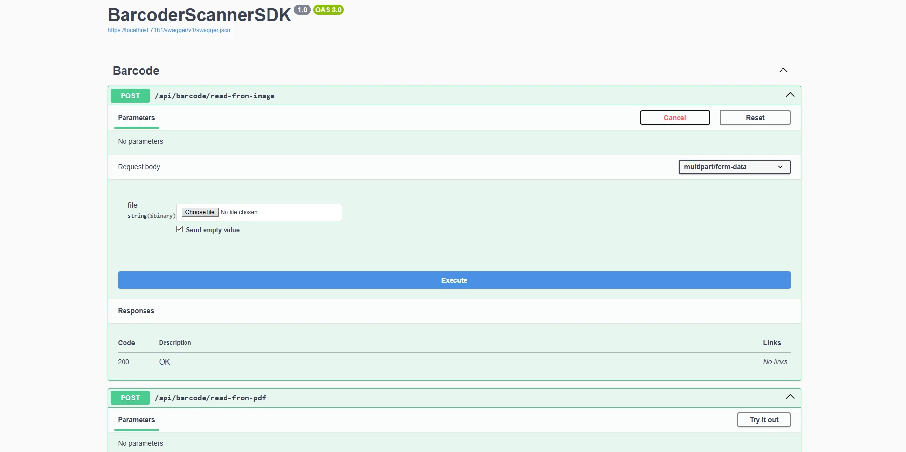 L'interface utilisateur Swagger présente l'API BarcoderScannerSDK avec deux points de terminaison POST pour la lecture de codes-barres à partir d'images et de PDF, incluant une interface de téléchargement de fichiers et des options de configuration des requêtes.