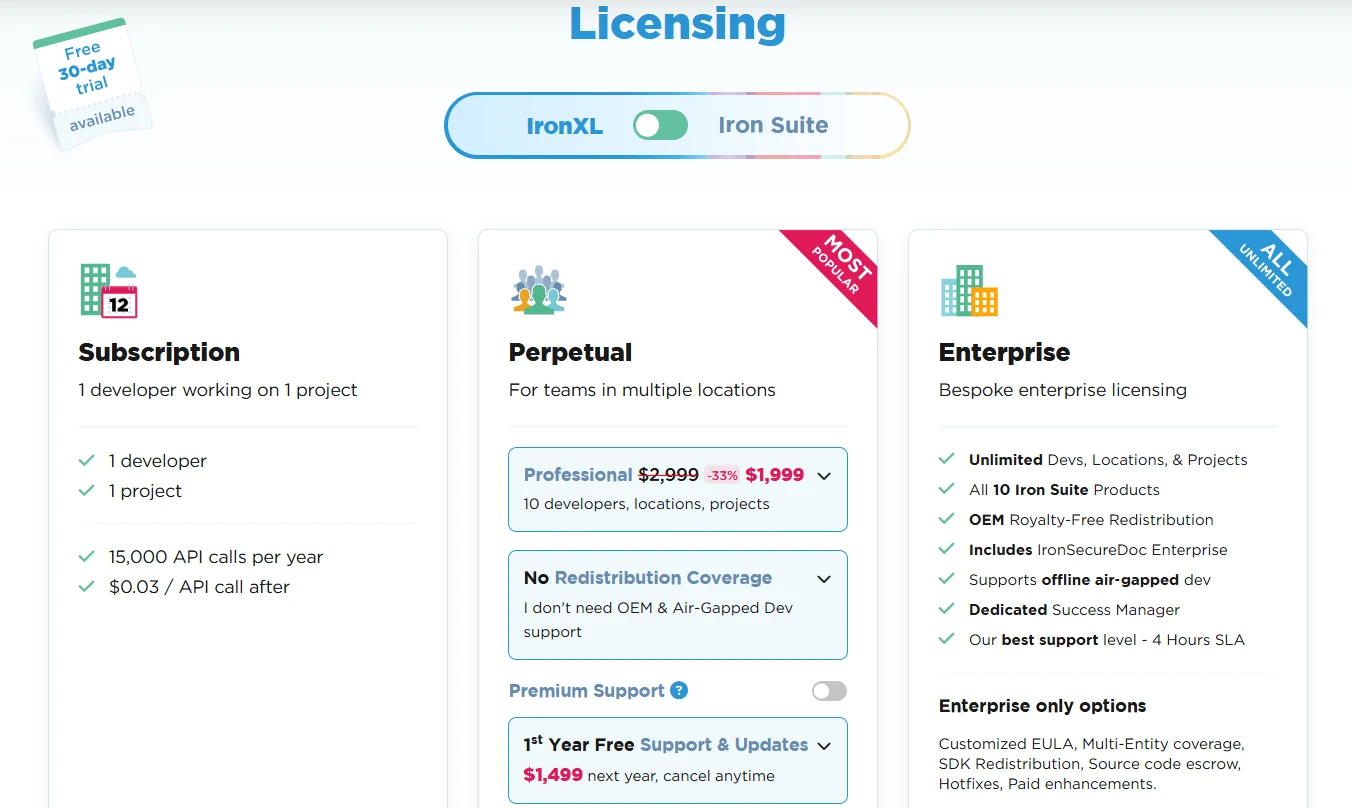 IronXL propose des niveaux de licence flexibles : abonnement pour développeurs individuels, licences perpétuelles à partir de 599 $ avec options pour les équipes et solutions pour entreprises avec assistance complète.