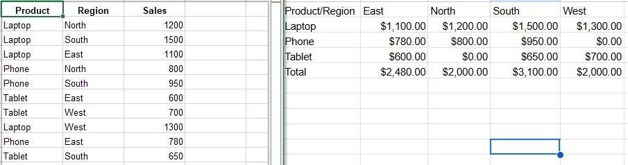 Cet exemple Interop crée un tableau croisé dynamique Excel natif avec le produit comme lignes, la région comme colonnes et les ventes additionnées dans la zone de données. Bien que fonctionnelle, cette approche nécessite l'installation de Microsoft Office et une gestion attentive des objets COM. La documentation Microsoft explique pourquoi cette approche n'est pas moderne. Du point de vue DevOps , cette approche est particulièrement problématique car elle ne peut pas être conteneurisée efficacement : vous ne pouvez pas installer Microsoft Office dans un conteneur Docker Linux ni le déployer dans des environnements sans serveur .