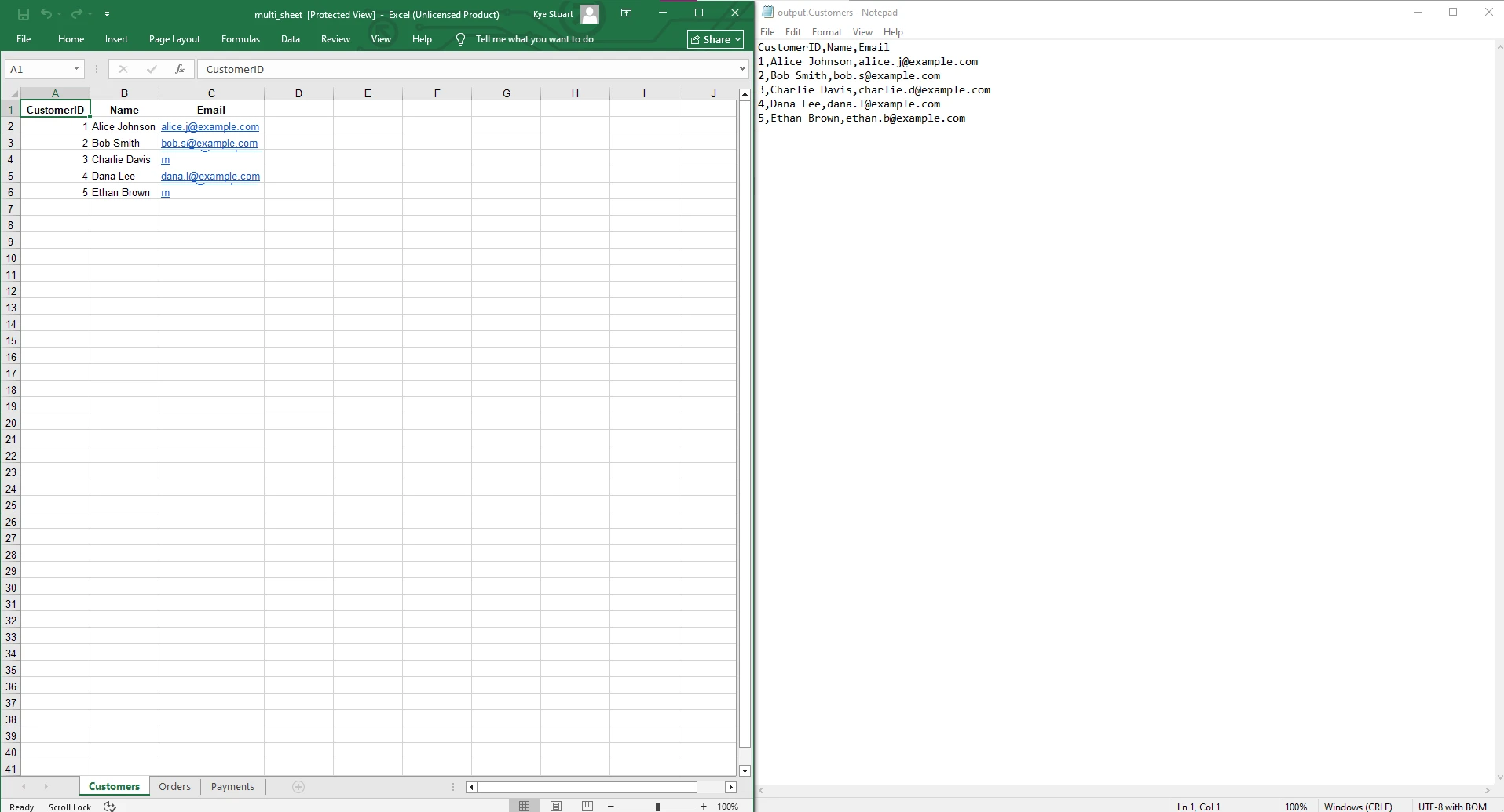 Pour comparer un fichier CSV avec le fichier .xlsx d'origine, examinons le fichier " Customers " ouvert dans le Bloc-notes et la feuille " Customers " affichée dans Excel :