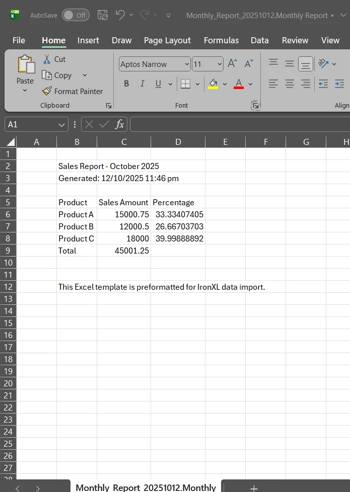 WorkBook workBook = WorkBook.Load("Monthly_Report_20251012.xlsx");