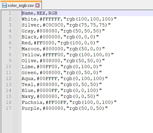 Dim csv = WorkBook.LoadCSV("color_srgb.csv", fileFormat:= ExcelFileFormat.XLSX, ListDelimiter:= ",")