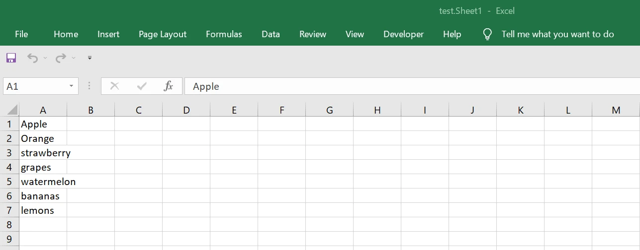 ! Feuille de calcul Excel affichant une liste de fruits (Pomme, Orange, Fraise, Raisin, Pastèque, Banane, Citron) dans la colonne A avec un formatage CSV correct et sans délimiteurs supplémentaires. Le fichier CSV de sortie