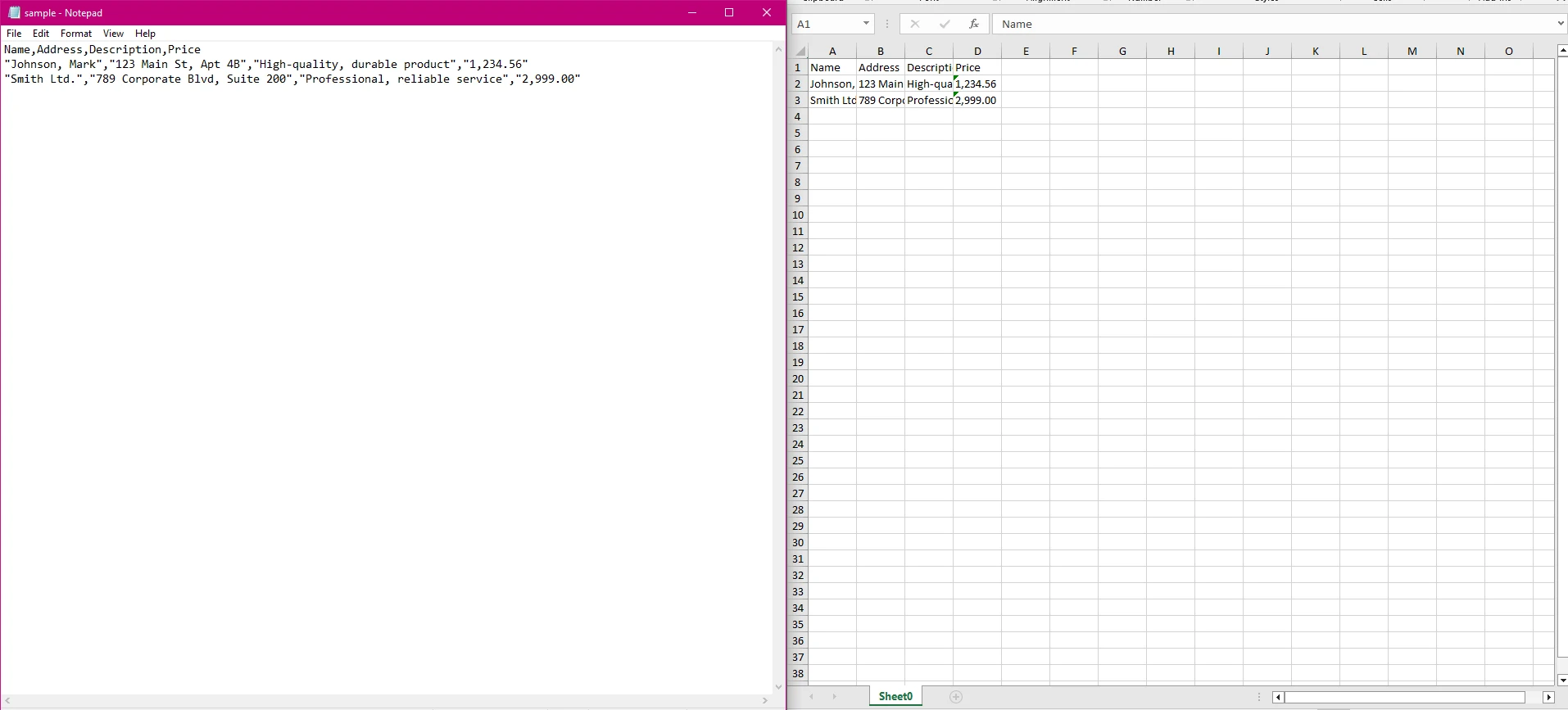 C# Read CSV with Commas in Data with IronXL : Image 2 - The sample CSV file (left) vs. the parsed Excel output (right)